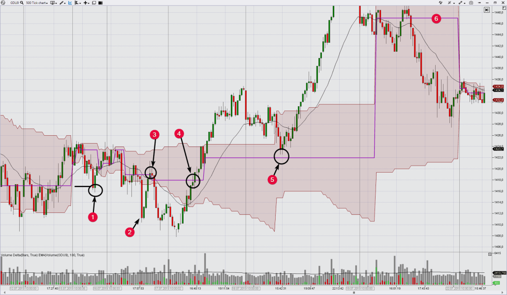 Пример использования индикатора — на 500-tick графике фьючерса на золото. Данные с Московской биржи, охват — середина июля 2019 года.