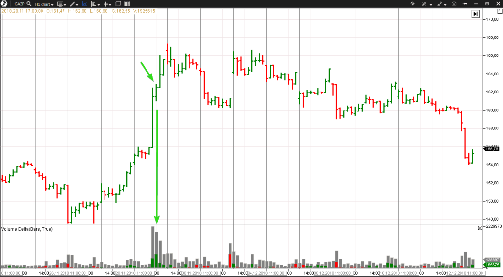 Справедливости ради признаем, что в суровой реальности идеальных экземпляров паттерна VSA встречается довольно мало, особенно на дневных периодах волатильных рынков. Поэтому в качестве поисков полезных примеров End of Rising Market заглянем на внутридневные графики. Исследуем рынок акций “Газпром”, отмотаем время в конец ноября, что найти типичную историю.