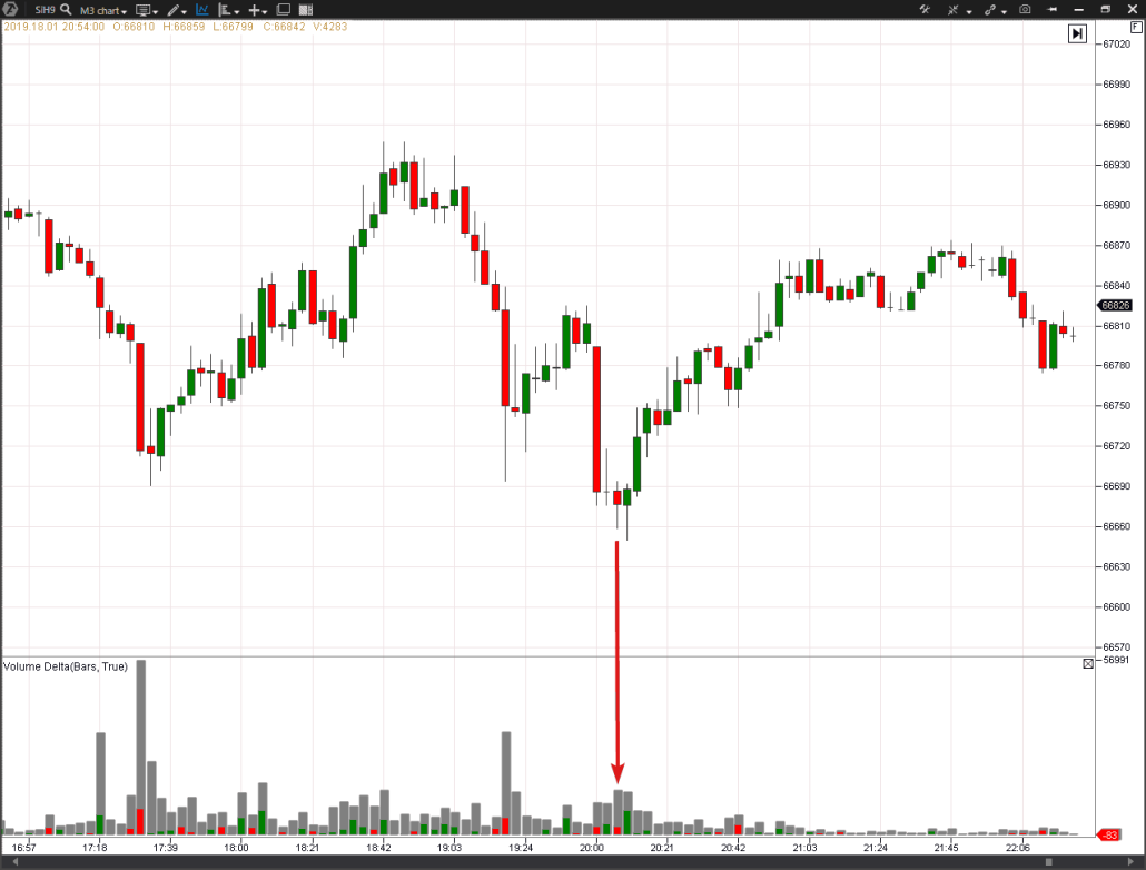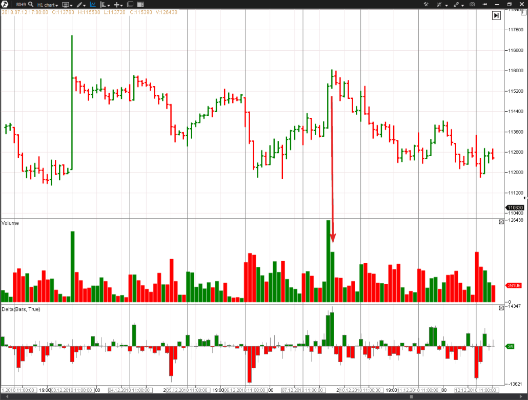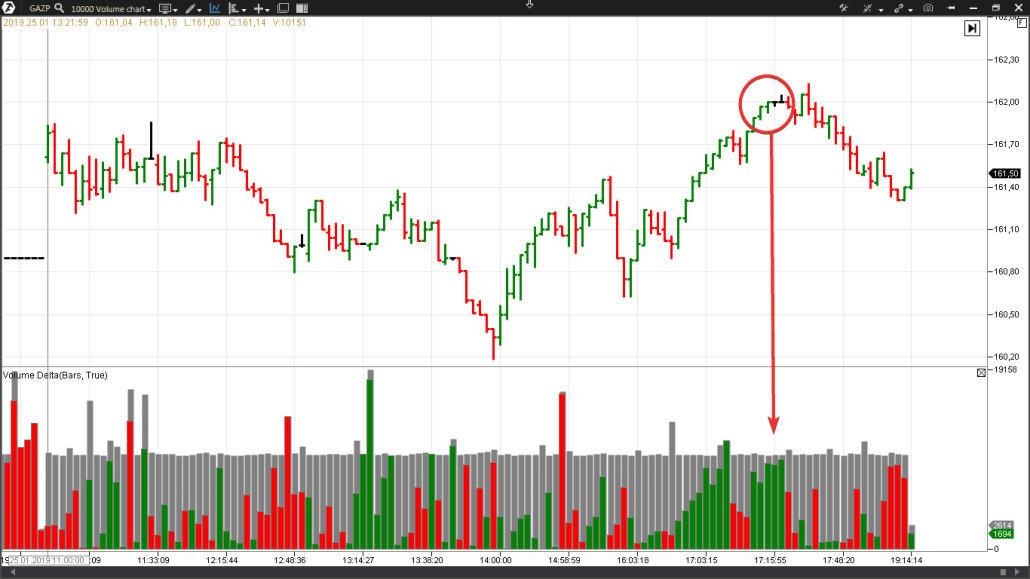 Рассмотрим подробней. На внутридневном графике приведена динамика торгов от 25 января 2019. На индикаторе объемов серым цветом указан общий объем (он почти одинаковый на большинстве баров, потому что мы выбрали тип графика Volume), красным и зеленым цветом отображается дельта.