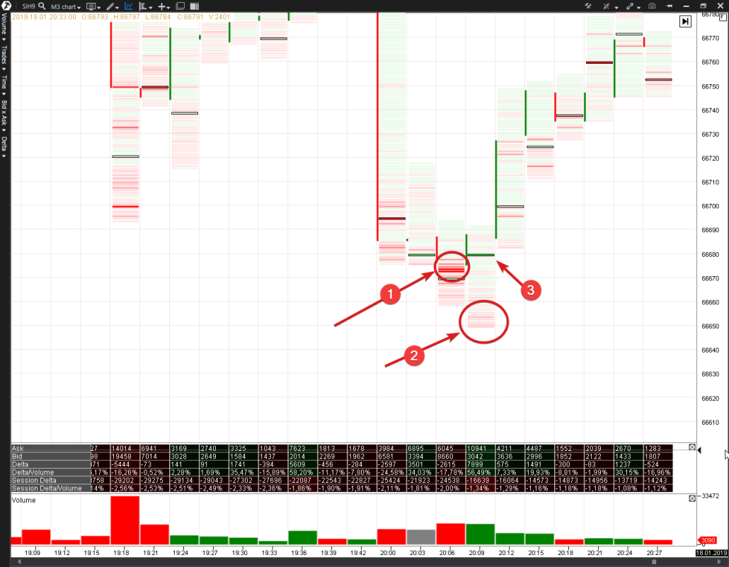 18 января 2019 года на внутридневном графике SiH9 “нарисовался” бар, отвечающий критериям Bag Holding. Смотрим картинку ниже, таймфрейм 3 минуты.
