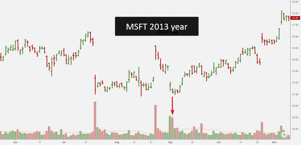 В последующие дни динамика цены стабилизировалась. А 10 сентября 2013 акция начала выдающийся ап-тренд от уровня в 31 доллар за штуку. Рост длился 5 лет, акция подорожала до более чем 113 долларов за акцию (+250%) в 2018, сделав Microsoft компанией с самой крупной капитализацией в мире.