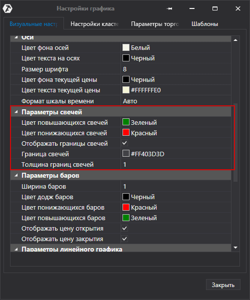 Однако цветовые предпочтения — это личное дело каждого, поэтому в платформе ATAS вы можете индивидуально подобрать цвета для вашего графика. Для этого необходимо открыть визуальные настройки графика (клик правой кнопкой мыши по графику) и перейти в раздел параметры свечей. Здесь вы найдете все необходимые настройки по кастомизации внешнего вида свечей на графике: