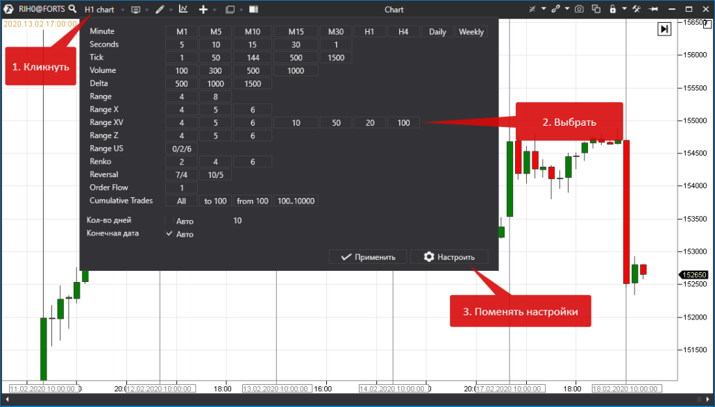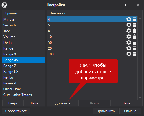 Далее необходимо выбрать период графика Range XV из представленных значений. Если предустановленные параметры не удовлетворяют вашим потребностям, нажмите “Настроить”. После чего вы сможете задать индивидуальные параметры для графика.