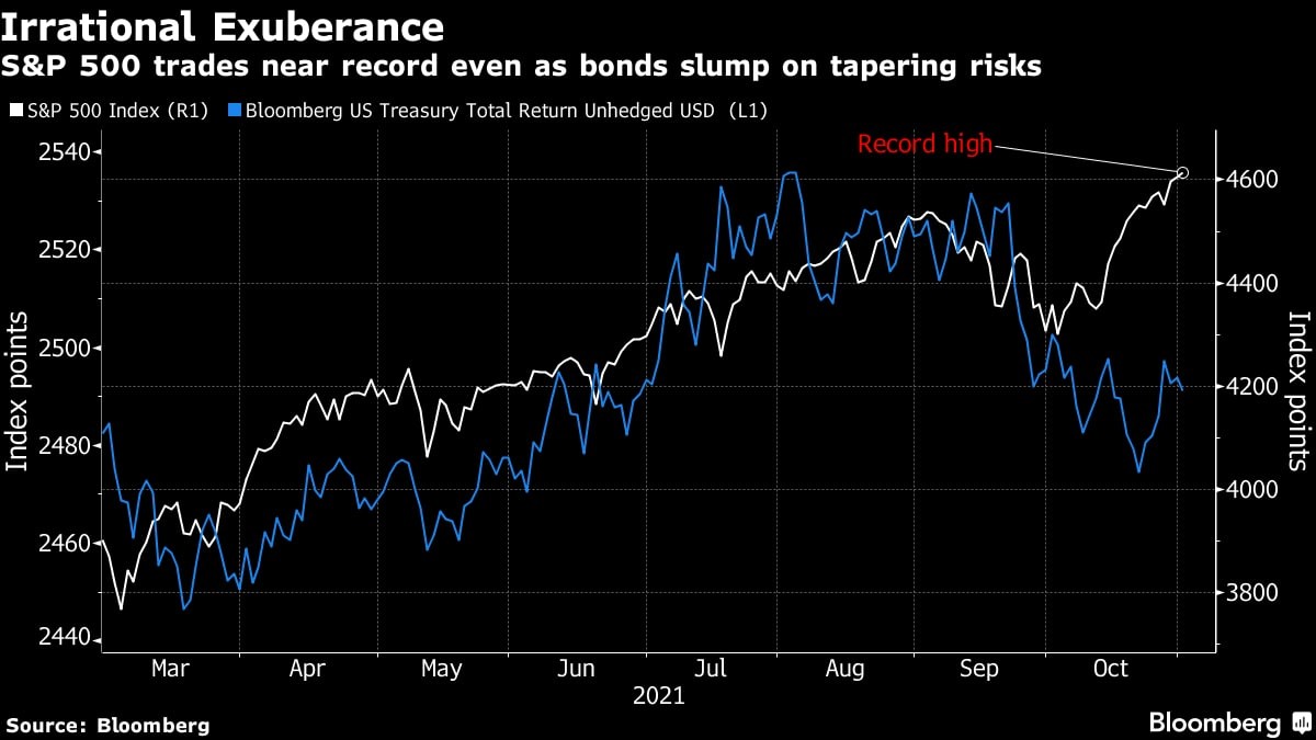 - Интересную дивергенцию высмотрел BBG: фондовый рынок в лице SP500 обновляет исторические максимумы, в то время как бонды закладывают начало сворачивания экстренного стимулирования и ужесточение денежно-кредитной политики. Кто-то из них должен сдаться — либо акции упадут, либо бонды вырастут. И об этом мы достаточно скоро узнаем. Нельзя исключать сценария, что после того как ФРС остановит печатный станок в середине следующего года, американский индекс SP500 ляжет в многолетний боковик. Рынок очень серьезно оторвался от экономической реальности и без работы печатного станка будем иметь ситуацию, что он весь свой рост уже реализовал на несколько лет вперед.