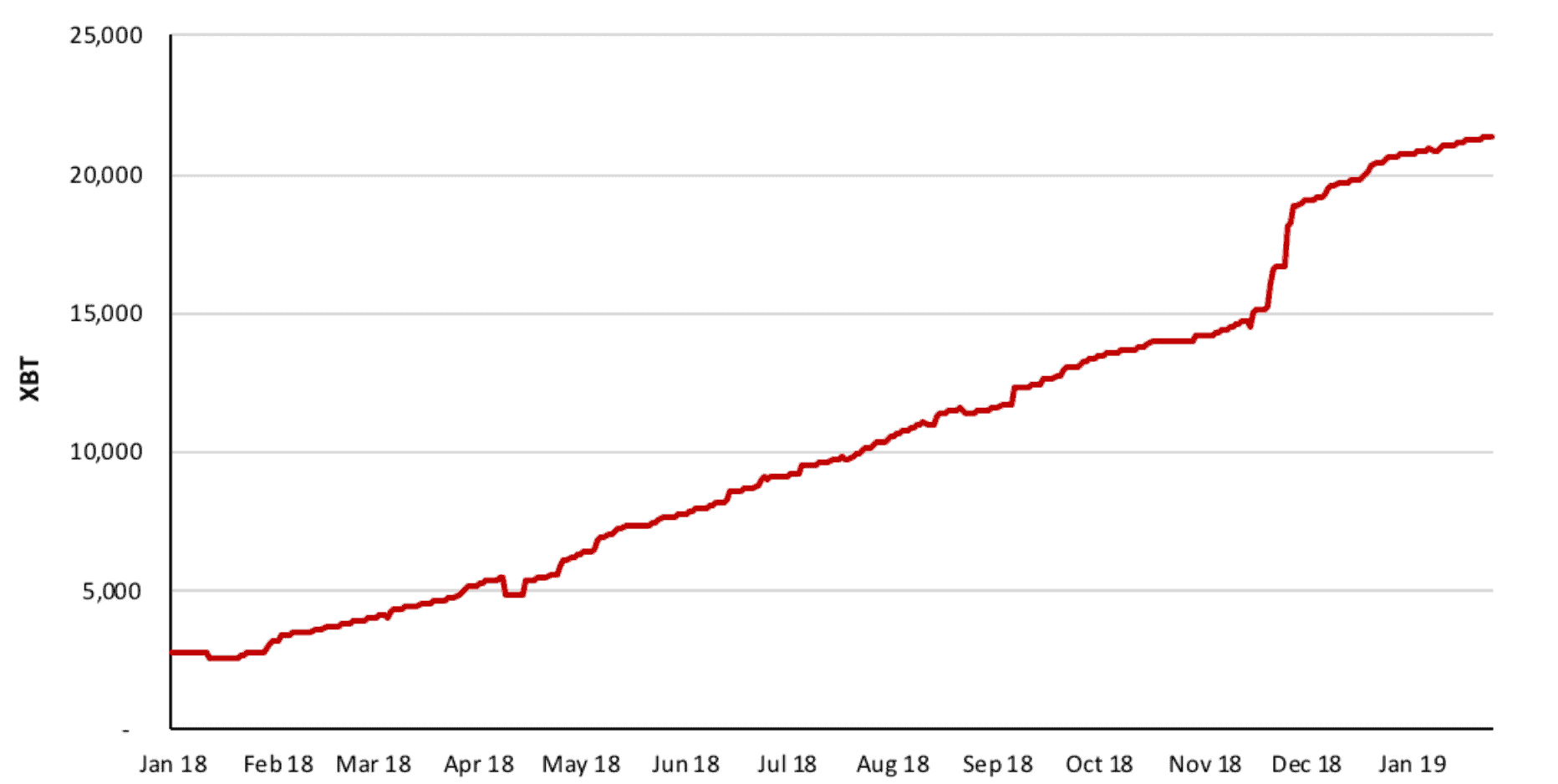 Подобные меры применяются на крупных товарных и фьючерсных биржах, таких как CME, где созданы клиринговые палаты. Объем страхового фонда Bitmex ежемесячно увеличивается, это видно на графике ниже, где представлена информация с официального сайта биржи.
