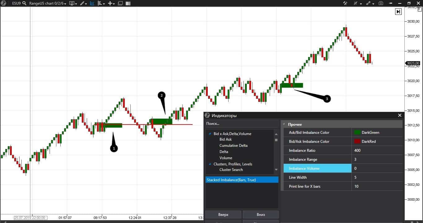 Посмотрим на ту же торговую сессию под другим углом, используя индикатор Stacked Imbalance. Этот индикатор показывает не крупные покупки, а существенное превышение рыночных ордеров одной из сторон. Существенное превышение — это 200-400%.
